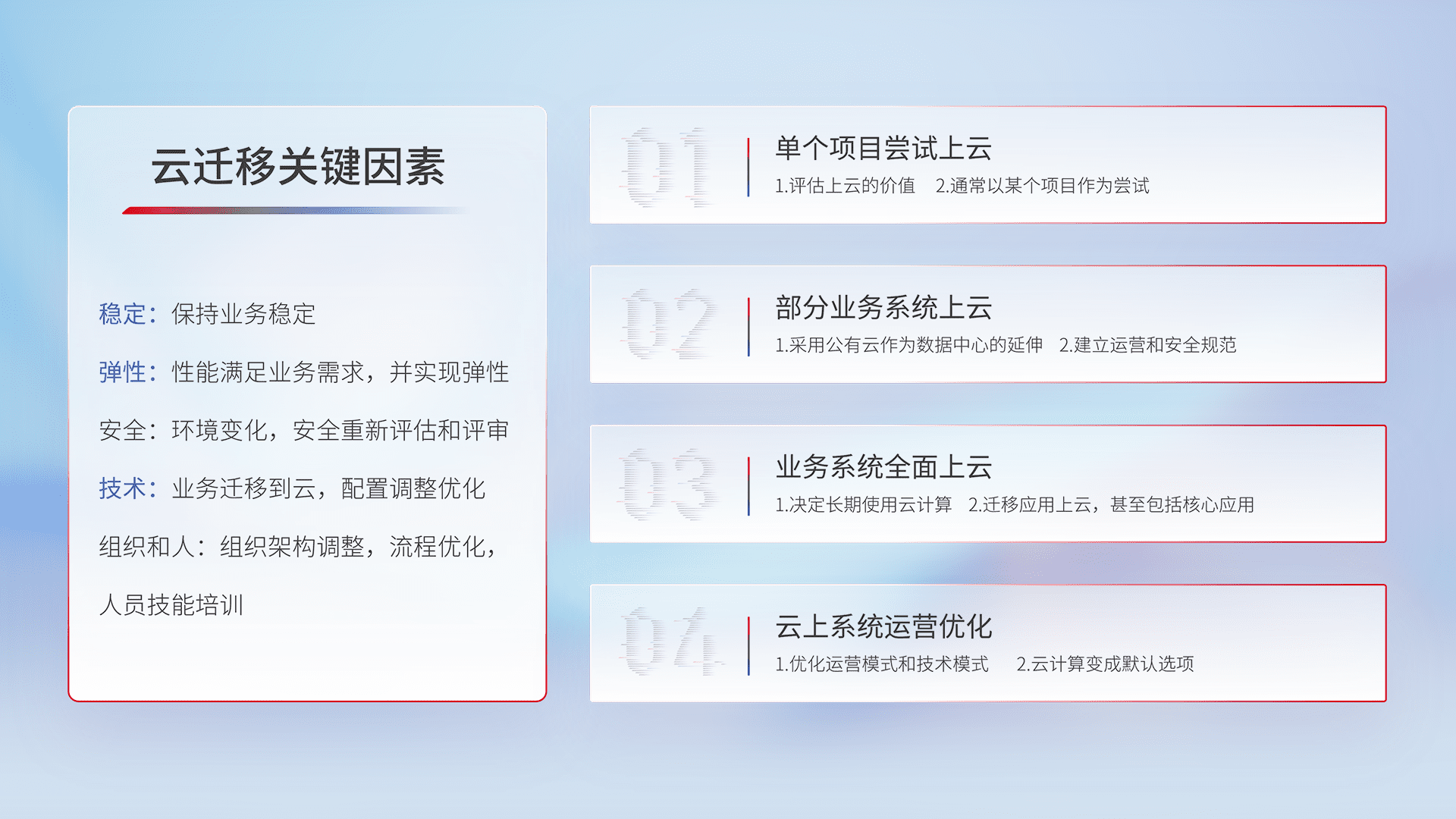 结合实际业务,,,,从规划设计、、云平台选型、、云原生改造、、、、数据迁移、、、、集成交付,,,,迁移全过程为客户识别最佳上云路径,,,,做好风险识别管理,,,设计网络架构、、、、身份权限、、、安全审计合规、、操作审计、、、、日志审计、、、监控告警策略、、多站点容灾设计等,,,,对云上基础设施进行整体规划,,提升IT治理水平,,,,以满足弹性、、、高可用、、、高性能的需求。。。