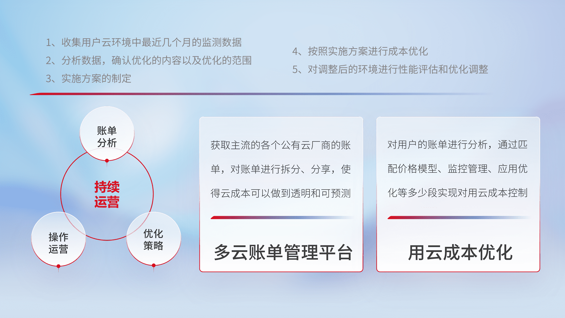通过多云纳管,,,以统一的资源数据模型把客户的云资源进行抽象和封装,,,进而实现对多云资源的统一操作,,保障云资源管理的可靠性、、、、稳定性与可用性。。。。量身定制化运维内容,,,,配置、、、、开发运维、、、补丁管理、、、、备份、、、监控、、、、认证和访问管理、、审计和日常巡检等,,保障在用云过程中的可靠度,,,,稳定度以及高可用率。。